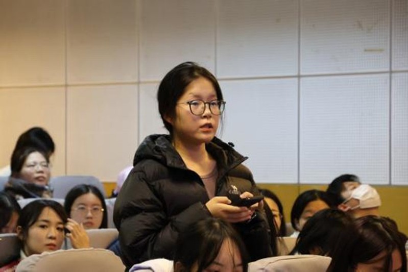 在互动环节,同学们踊跃提问,围绕“如何成为四有好老师”“传统教育精神在今天的实践意义”等话题与张老师展开交流。
