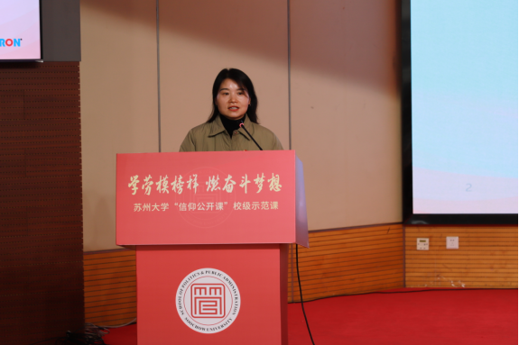 11月26日下午,我校在独墅湖校区炳麟图书馆学术报告厅举行“学劳模榜样,燃奋斗梦想”苏州大学“信仰公开课”校级示范课(青马公开课)。全国劳动模范、全国“五一劳动奖章”获得者、中国工会第十八次全国代表大会代表、江苏省第十四届人民代表大会代表皮欠红应邀授课,政治与公共管理学院党委副书记、副院长李恩秀,政治与公共管理学院团委书记张凯丽以及学院辅导员老师出席活动。2025年苏州大学“青年马克思主义者培养工程”秋季班学员,政治与公共管理学院“青年马克思主义者培养工程”学员以及青年学生代表参加活动。本次活动由政治与公共管理学院团委学生兼职副书记、2024级公共管理专业研究生安嘉仪主持。