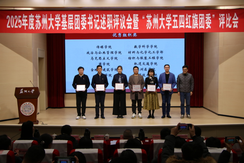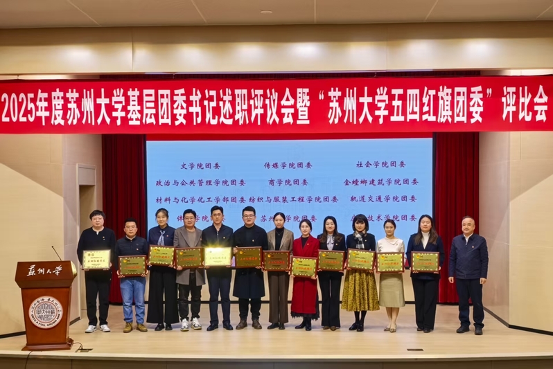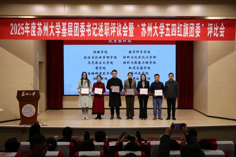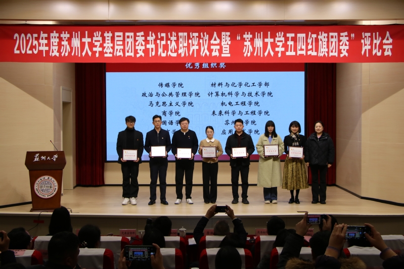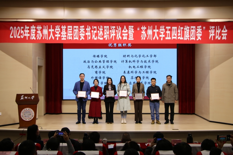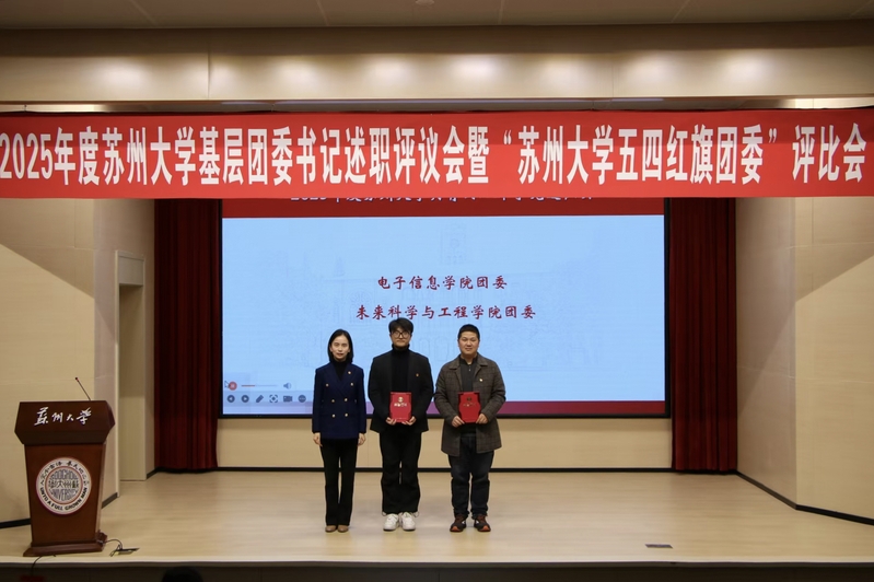 电子信息学院团委、未来科学与工程学院团委在2025年度共青团工作专项考核中进步显著,获评“2025年度苏州大学共青团工作争先进位奖”,严韵致为获奖单位颁奖。
