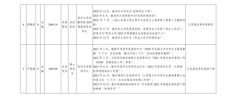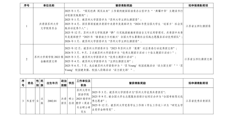 根据团省委《江苏省五四红旗团委(团支部)、江苏省优秀共青团员、江苏省优秀共青团干部评选表彰工作办法》要求,拟将以下人选(单位)作为申报人选(单位),现进行公示。公示时间为2026年1月15日至2026年1月21日。对公示对象有何反映,请在公示期间与团省委高校工作部或苏州大学团委实名反馈。