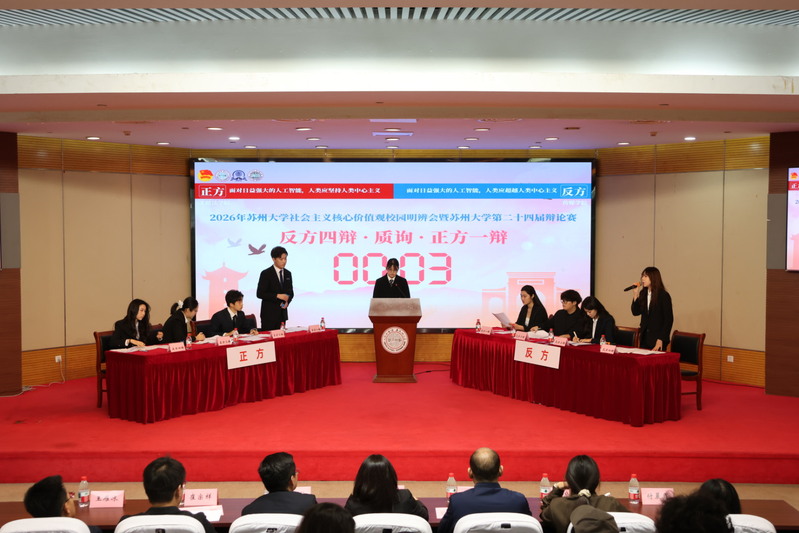 4月8日下午,2026年社会主义核心价值观校园明辨会暨苏州大学第二十四届辩论赛在独墅湖校区炳麟图书馆学术报告厅落幕。本次比赛由共青团苏州大学委员会主办,我校学生会、东吴辩论社共同承办。