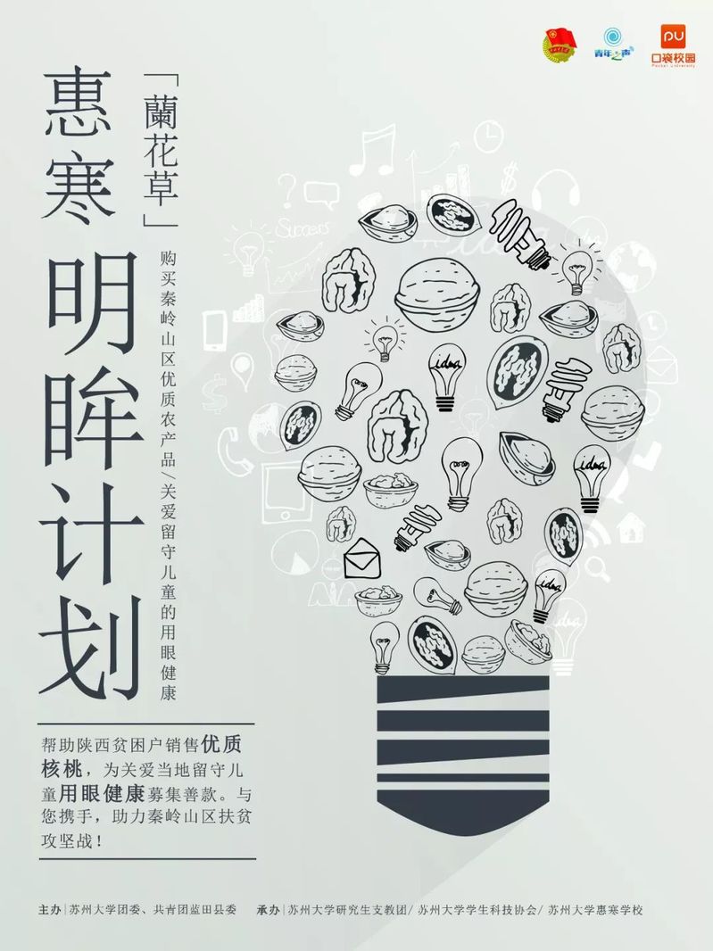 “惠寒•兰花草”明眸计划,由苏州大学研究生支教团发起的第三期“扶贫助农、支教助学”行动,通过帮助陕西秦岭贫困户销售优质核桃,为关爱当地留守儿童用眼健康募集善款。在帮助贫困户打开销售渠道的同时,助推孩子们的成长成才,助力秦岭山区扶贫攻坚战!