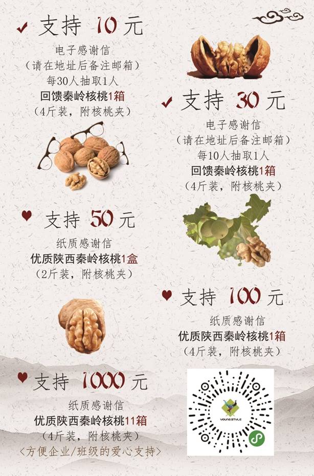 ● 本次公益销售的核桃除新疆、西藏、内蒙古、青海及港澳台地区全国包邮,请注明详细邮寄地址和联系方式,便于我们邮寄核桃和纸质感谢信给您。